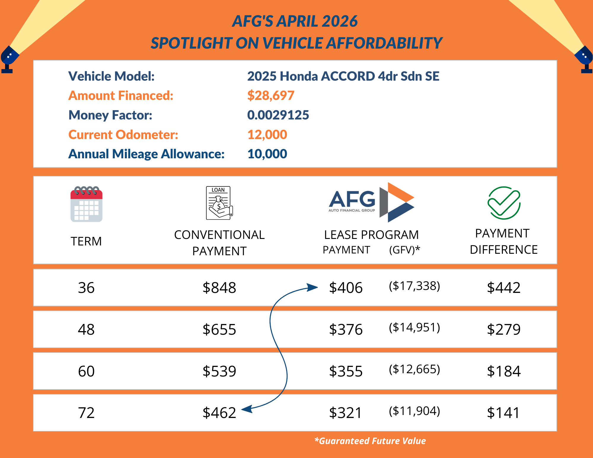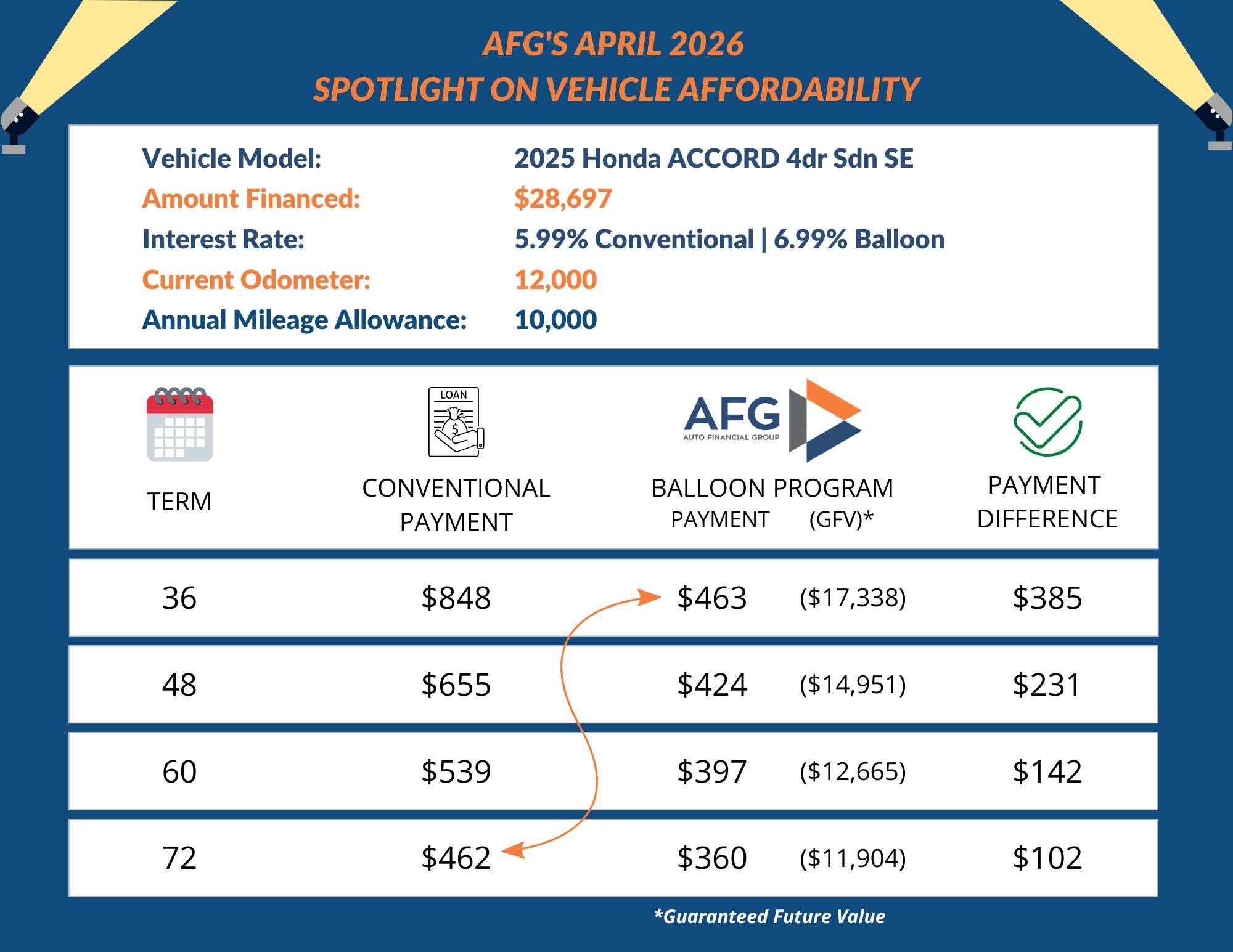 Affordability is a critical concern for many borrowers in a highly fluctuating vehicle market. AFG will highlight a vehicle each month that showcases how the AFG walk-away balloon and vehicle leasing programs offer a more affordable payment compared to conventional financing.